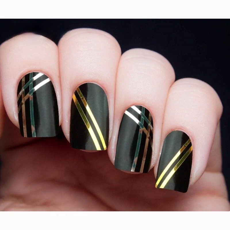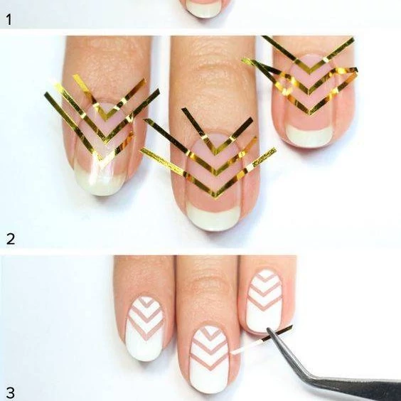 ابتدا لاک پایه را بر روی ناخن بزنید. سپس این نوار چسبی را به شکل های متفاوتی بر روی ناخن خود چسبانده و مانند شابلون از آن استفاده کنید و بر روی آن لاک بزنید و بعد از خشک شدن لاک، آنها را بردارید.